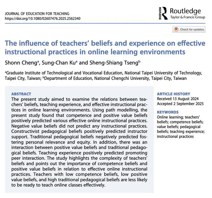 Image credit: UnsplashThe present study aimed to examine the relations between teachers’ beliefs, teaching experience, and effective instructional practices in online learning environments. Using path modelling, the present study found that competence and positive value beliefs positively predicted various effective online instructional practices. Negative value beliefs did not predict any instructional practices. Constructivist pedagogical beliefs positively predicted instructor support. Traditional pedagogical beliefs negatively predicted fostering personal relevance and equity. In addition, there was an interaction between positive value beliefs and traditional pedagogical beliefs. Teaching experience positively predicted promoting peer interaction. The study highlights the complexity of teachers’ beliefs and points out the importance of competence beliefs and positive value beliefs in relation to effective online instructional practices. Teachers with low competence beliefs, low positive value beliefs, and high traditional pedagogical beliefs are less likely to be ready to teach online classes effectively.
