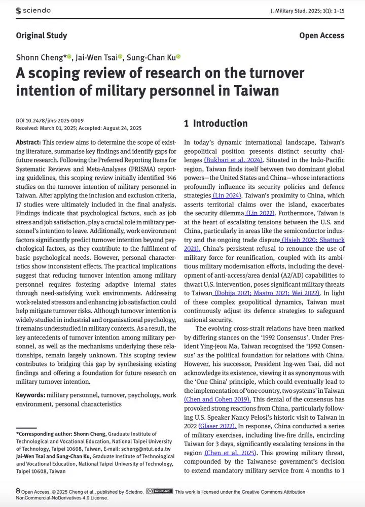 Image credit: UnsplashThis review aims to determine the scope of existing literature, summarise key findings and identify gaps forfuture research. Following the Preferred Reporting Items forSystematic Reviews and Meta-Analyses (PRISMA) reporting guidelines, this scoping review initially identified 346 studies on the turnover intention of military personnel inTaiwan. After applying the inclusion and exclusion criteria,17 studies were ultimately included in the final analysis.Findings indicate that psychological factors, such as job stress and job satisfaction, play a crucial role in military per-sonnel’s intention to leave. Additionally, work environment factors significantly predict turnover intention beyond psychological factors, as they contribute to the fulfilment of basic psychological needs. However, personal characteristics show inconsistent effects. The practical implications suggest that reducing turnover intention among military personnel requires fostering adaptive internal states through need-satisfying work environments. Addressing work-related stressors and enhancing job satisfaction could help mitigate turnover risks. Although turnover intention is widely studied in industrial and organisational psychology,it remains understudied in military contexts. As a result, the key antecedents of turnover intention among military personnel, as well as the mechanisms underlying these relationships, remain largely unknown. This scoping review contributes to bridging this gap by synthesizing existing findings and offering a foundation for future research on military turnover intention.