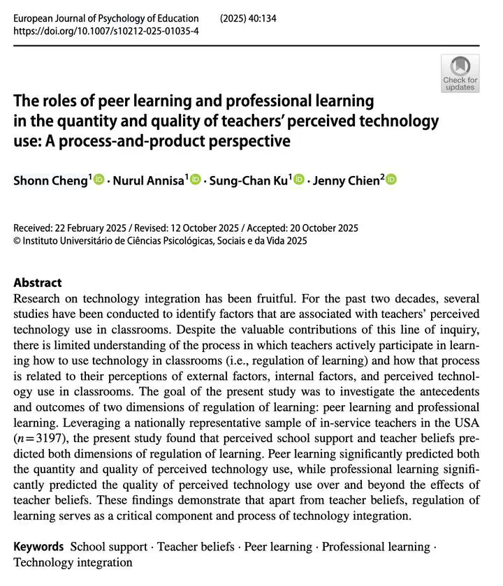 Image credit: UnsplashResearch on technology integration has been fruitful. For the past two decades, several studies have been conducted to identify factors that are associated with teachers’ perceived technology use in classrooms. Despite the valuable contributions of this line of inquiry, there is limited understanding of the process in which teachers actively participate in learning how to use technology in classrooms (i.e., regulation of learning) and how that process is related to their perceptions of external factors, internal factors, and perceived technology use in classrooms. The goal of the present study was to investigate the antecedents and outcomes of two dimensions of regulation of learning. Leveraging a nationally representative sample of in-service teachers in the USA (n = 3197), the present study found that perceived school support and teacher beliefs predicted both dimensions of regulation of learning. Peer learning significantly predicted both the quantity and quality of perceived technology use, while professional learning significantly predicted the quality of perceived technology use over and beyond the effects of teacher beliefs. These findings demonstrate that apart from teacher beliefs, regulation of learning serves as a critical component and process of technology integration.